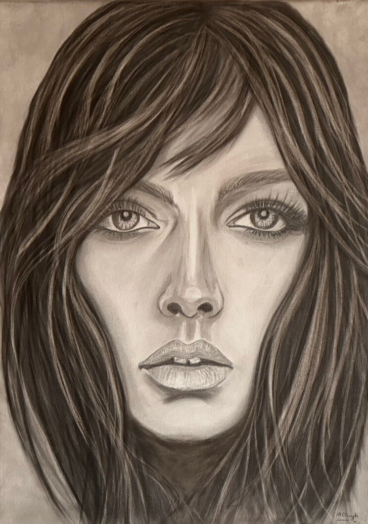 Ontdek de diepte van emoties met dit prachtige vrouwelijke houtskooltekening. 'Oprecht' belichaamt een unieke expressie die elke kamer tot leven brengt en een verhaal vertelt.